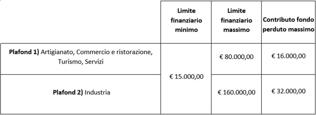 Il Progetto di impresa prevede un limite minimo e massimo di intervento e un valore massimo non superabile del contributo in conto capitale a fondo perduto: